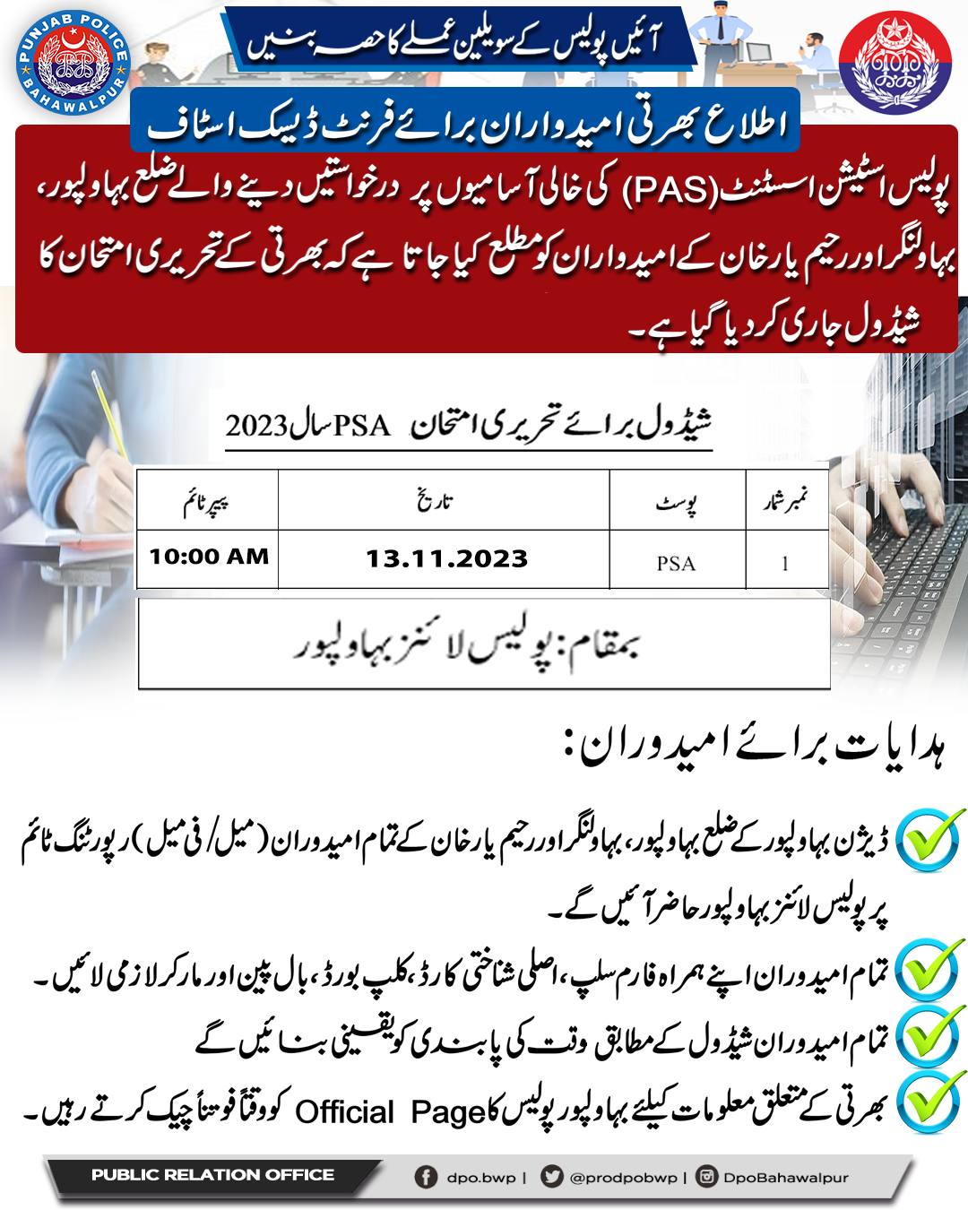 پولیس اسٹیشن اسٹنٹ (پی ایس اے) کی خالی آسامیوں پر درخواستیں دینے والے ضلع بہاولپور، بہاولنگر اور رحیم یار خان کے امیدواران کو مطلع کیا جاتا ہے کہ بھرتی کے تحریری امتحان کا شیڈول جاری کر دیا گیا ہے۔
