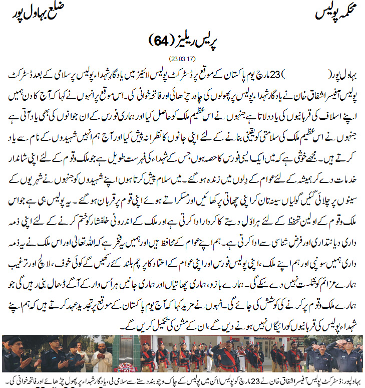 یوم پاکستان 23 مارچ کے موقع پر ڈسٹرکٹ پولیس لائنزبہاولپور یادگار شہدا پولیس پرسلامی کے بعد ڈسٹرکٹ پولیس آفیسر اشفاق احمد خان نے یاد گار شہدا ء پولیس پر پھولوں کی چادر چڑھائی اور اور فاتحہ خوانی کی.