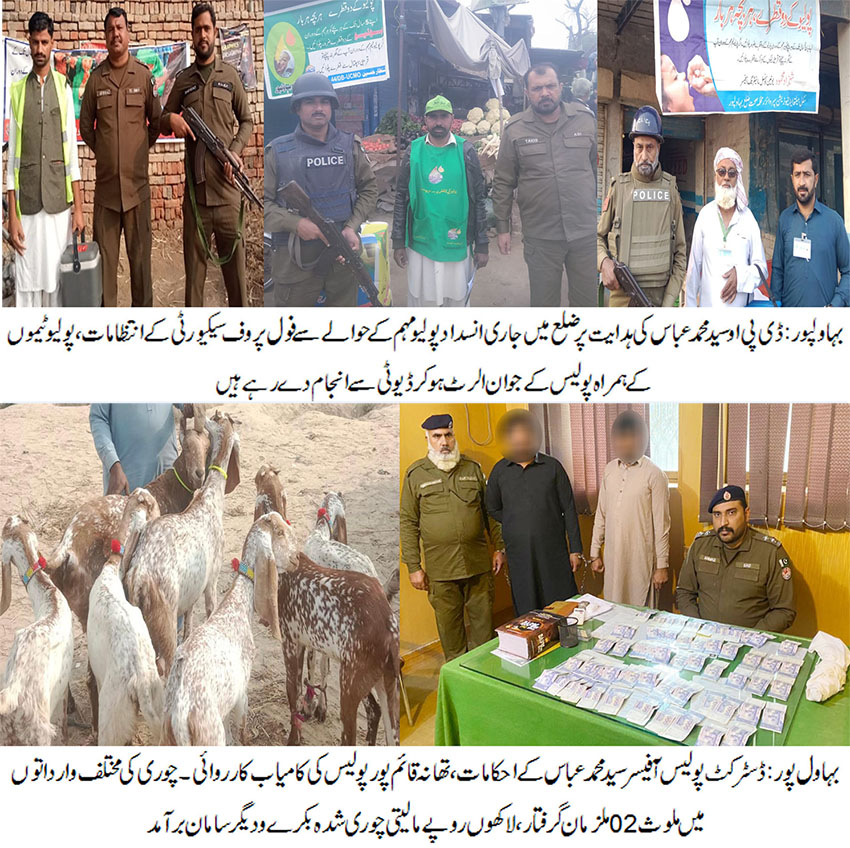 تفصیل کے مطابق انسپکٹر جنرل آف پولیس پنجاب کی '' عوام خدمت پالیسی ''کے تحت ڈسٹرکٹ پولیس آفیسر بہاولپور سید محمد عباس کی قیادت اور کامیاب پولیسنگ کے تحت نتائج آنے کا سلسلہ جاری ہے، تھانہ قائم پور پولیس کی کامیاب کارروائی۔ ایس ایچ او تھانہ قائم پور محمد احمد چیمہ اور ٹیم نے جدید ٹیکنالوجی کا سہارا لیتے ہوئے شب و روز کی محنت کے بعد چوری کی متعدد مقدمات میں ملوث 02ملزمان ارشد اور محسن گرفتار کرلیا۔ملزمان نے دوران اینٹروگیشن قائم پور کے علاوہ دیگر اضلاع میں بھی چوری کے متعدد مقدمات میں ملوث ہونے کا اعتراف بھی کیا۔، ملزمان کی نشاندہی پر 07عدد بکرے، پچاس ہزار روپے نقد رقم، کھاد کی بوریاں ، سپرے اور چوری شدہ موبائل فون برآمد کرلیا۔ مال مسروقہ کو قانونی طریقہ کار کے بعد اصل مالکان کے حوالے کیا جارہا ہے۔اس حوالے سے ڈی پی او سید محمد عباس نے اپنے پیغام میں کہا کہ بہاول پور پولیس شہریوں کی حفاظت کے لیے دن رات محنت کررہی ہے،اگر کوئی جرم سرزد ہوتا ہے تو اس کو ٹریس کرنا اور شہریوں کا لوٹا ہوا مال بر آمد کرنا پولیس کے لیے ایک اہم ٹاسک ہوتا ہے۔ جرائم پیشہ افراد کو ہر صورت کیفر کردار تک پہنچایا جائے گا۔