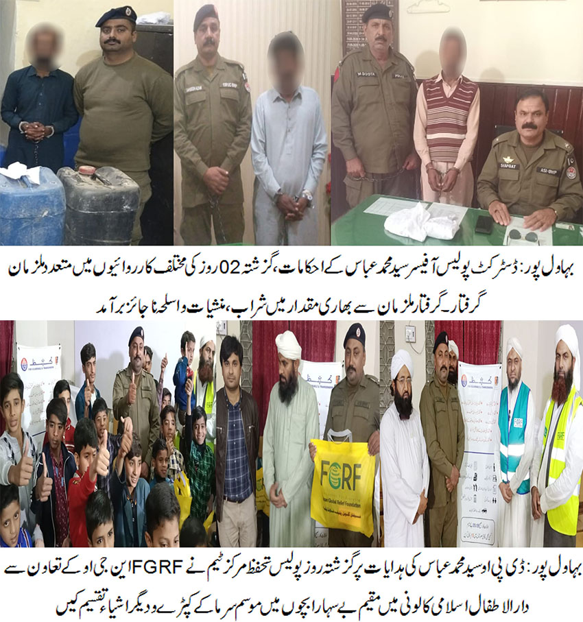 بہاولپور( )آئی جی پنجاب ڈاکٹر عثمان انور کے ویژن کے مطابق، ڈی پی او سید محمد عباس کی ہدایات پر پولیس تحفظ مرکز میں معاشرے کے کمزور و محکوم طبقات کے افراد کی قانونی، سماجی و معاشرتی مدد کا عمل جاری۔ تحفظ مرکز کی ٹیم نے FGRFفلاحی ادارے کے تعاون سے دارالاطفال اسلامی کالونی میں مقیم بے سہارا بچوں میں موسم سرما کے کپڑے و دیگر اشیا تقسیم کیں ۔عوامی خدمت کا یہ سفر جاری رہے گا، ڈی پی او سید محمد عباس