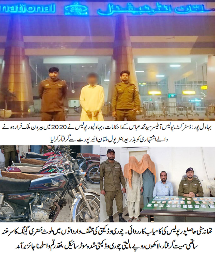 تفصیلات کے مطابق انسپکٹر جنرل آف پولیس پنجاب اور ایڈیشنل انسپکٹر جنرل آف پولیس جنوبی پنجاب کی مفرور ملزمان کی گرفتاریوں کے حوالے جاری احکامات کی روشنی میں ڈسٹرکٹ پولیس آفیسر سید محمد عباس نے بہاولپور سے بیرون ملک فرار ہونے والے مجرمان اشتہاریوں کی گرفتاریوں اور ان کے خلاف ضابطہ کی کارروائیاں کرنے کے احکامات جاری کئے ، جس کے نتیجہ میں بہاولپور پولیس نے 2020میں ملک سے فرار ہونے والے مجرم اشتہاری محبوب احمد ولدخادم حسین جو کہ مقدمہ نمبر 29/20بجرم 302/109/148/149ت پ (قتل) میں تھانہ ڈیراورپولیس کو مطلوب تھا، کو بذریعہ انٹر پول ریڈ وارنٹ جاری کروا کر بیرون ملک سے واپسی پر ملتان ائیر پورٹ سے گرفتار کرکے بہاولپور لایا گیا ہے۔ڈسٹرکٹ پولیس آفیسر سید محمد عباس نے اس حوالے سے بات کرتے ہوئے کہا کہ مجرم جتنا بھی ہوشیار کیوں نہ ہو قانون کی گرفت سے نہیں بچ سکتا۔شہریوں کی دادرسی اس صور ت میں ہوسکتی ہے جب ہم ان کے جان ومال کانقصان کرنے والوں کو آہنی ہاتھوں سے نمٹیں گے۔ انہوں نے مزید کہا کہ آئی جی پنجاب کے احکامات کی روشنی میں مزید ایسی کارروائیوں کا سلسلہ جاری رہے گا اور مفرور ملزمان کو گرفتار کر کے قانون کے کٹہرے میں لایا جائے گا۔