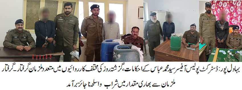 بہاول پور( )ڈسٹرکٹ پولیس آفیسر سید محمد عباس کے احکامات ، گزشتہ روز کی مختلف کارروائیوں میں 28 ملزمان گرفتار۔گرفتار ملزمان سے بھاری مقدار میں شراب و اسلحہ ناجائز برآمد، ملزمان پابند سلاسل۔ جرائم پیشہ افراد کا تعاقب جاری رکھا جائیگا، ڈی پی او سید محمد عباس