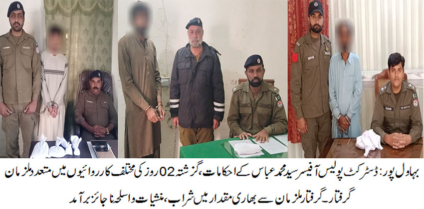 بہاول پور( )ڈسٹرکٹ پولیس آفیسر سید محمد عباس کے احکامات ، گزشتہ 02روز کی مختلف کارروائیوں میں 09ملزمان گرفتار۔گرفتار ملزمان سے بھاری مقدار میں شراب،منشیات واسلحہ ناجائزبرآمد، ملزمان پابند سلاسل۔ جرائم پیشہ افراد کا تعاقب جاری رکھا جائیگا، ڈی پی او سید محمد عباس