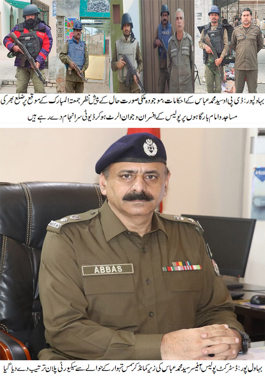 بہاول پور( )ڈی پی او سید محمد عباس کے احکامات، جمعتہ المبارک کے روز ایس ڈی پی اوز اور ایس ایچ اوز کے سیکیورٹی کے حوالے سے مساجد اور امام بارگاہوں کے وزٹ،موجودہ ملکی صورتحال کے پیش نظر ڈیوٹی پر مامور اہلکاروں کو الرٹ رہنے کی ہدایت، سیکیورٹی فرائض میں غفلت ہرگز برداشت نہیں کی جائے گی، ڈسٹرکٹ پولیس آفیسر سید محمد عباس