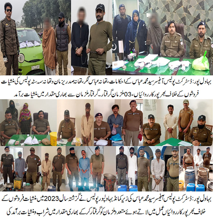 تفصیلات کے مطابق وزیر اعلی پنجاب اور انسپکٹر جنرل آف پولیس پنجاب کی طرف منشیات فروشوں کی سرکوبی کے لئے جاری کردہ احکامات کی روشنی میں اور ڈسٹرکٹ پولیس آفیسر سید محمد عباس کی زیر کمانڈ بہاول پور پولیس نے گزشتہ سال سپیشل ٹیمیں تشکیل دے کر منشیات فروشوں کی گرفتاریاں عمل میں لاتے ہوئے 2004 مقدمات درج رجسٹرڈ کرکے 2024ملزمان کو بند حوالات کیا۔گرفتار ملزمان کے قبضہ سے 843کلو 722گرام چرس،48کلو 129 گرام ہیروئن، 04کلو 131 گرام کرسٹل آئس،140کلو 417گرام افیون، 734 کلو 600گرام بھنگ، 58127لیٹر شراب اور 233 چالو بھٹیاں برآمد کیں۔اس حوالے سے ڈی پی او سید محمد عباس نے افسران کو ہدایات جاری کرتے ہوئے کہا کہ منشیات فروشوں کے خلاف خفیہ سٹنگ آپریشن کو مزید تیز کیا جائے۔منشیات مافیا کے خلاف بلا امتیاز کارروائیاں عمل میں لائی جائیں گی، خاص کر تعلیمی اداروں میں یہ فعل ہر گز برداشت نہیں کیا جائے گا۔منشیات فروشوں کے خلاف جاری مہم میں تمام تر وسائل کو بروئے کار لاتے ہوئے مزید کارروائیاں عمل میں لائی جائیں۔ انہوں نے مزید کہا کہ منشیات ایک لعنت ہے جس کا بہاولپور سے خاتمہ ہر صورت یقینی بنایا جائے گا۔