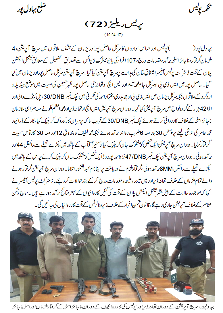 بہاولپور پولیس اور حساس اداروں کا سرکل حاصل پور اور یزمان کے مختلف علاقوں میں سرچ آپریشن 4 ملازمان گرفتار ناجائز اسلحہ برآمد مقدمات درج 107 افراد کی بزریعہ بائومیٹرک ڈیوائس ویریفکشن