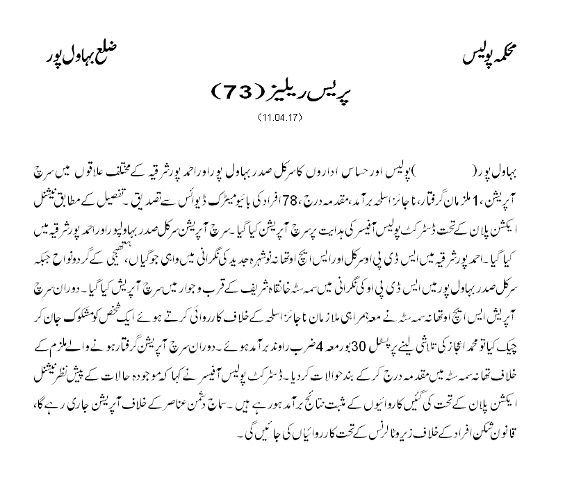 بہاولپور پولیس اور حساس اداروں کا صدر سرکل بہاولپور اور احمدپورشرقیہ کے مختلف علاقوں میں سرچ آپریشن 1ملزم گرفتار ناجائز اسلحہ برآمد مقدمہ درج 78 افراد کی بزریعہ بائومیٹرک ڈیوائس ویریفکشن