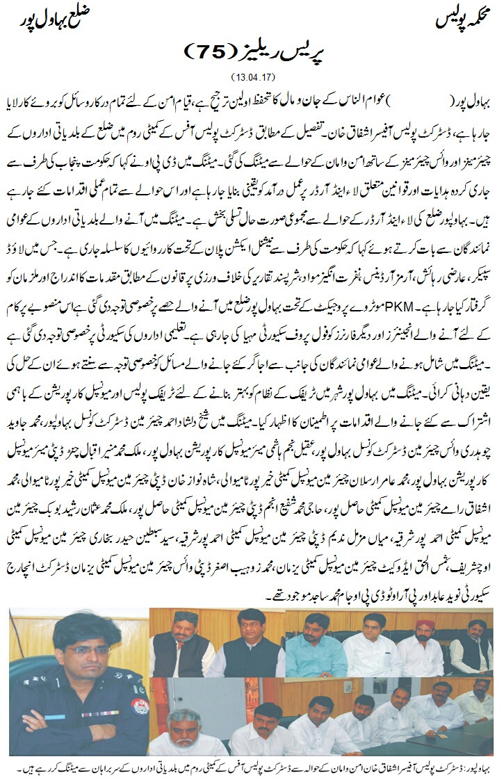 عوام الناس کے جان و مال کا تحفظ اولین ترجیح ھے،قیام امن کےلیے تمام درکار وسائل کو بروۓ کار لایا جارہا ھے۔ ڈسٹرکٹ پولیس آفیسر اشفاق خان