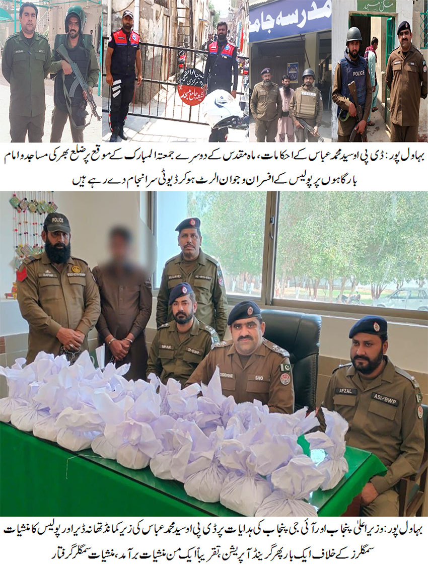 بہاول پور( )ڈی پی او سید محمد عباس کے احکامات، ماہ مقدس کے دوسرے جمعتہ المبارک کے موقع پر ایس ڈی پی اوز اور ایس ایچ اوز کے سیکیورٹی کے حوالے سے مساجد اور امام بارگاہوں کے وزٹ،موجودہ ملکی صورتحال کے پیش نظر ڈیوٹی پر مامور اہلکاروں کو الرٹ رہنے کی ہدایت، سیکیورٹی فرائض میں غفلت ہرگز برداشت نہیں کی جائے گی، ڈسٹرکٹ پولیس آفیسر سید محمد عباس