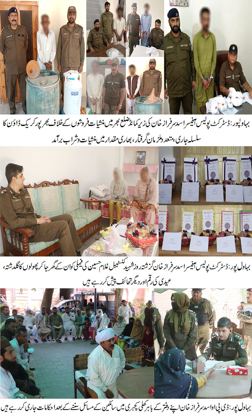 بہاولپور( )وزیر اعلی پنجاب کی جانب سے منشیات فروشوں کے خلاف خصوصی مہم، ڈی پی او اسد سرفراز خان کی زیر کمانڈ ضلع بھر میں منشیات فروشوں کے خلاف بھر پور کریک ڈائون کا سلسلہ جاری، گزشتہ 10روز میں متعدد منشیات فروش گرفتار کرکے ان کے قبضہ سے بھاری مقدار میں شراب و منشیات برآمد کرلی۔ضلع بہاولپور کو منشیات سے پاک کرنے کا عزم ہر صورت پورا کیا جائے گا، ڈی پی او اسد سرفراز خان