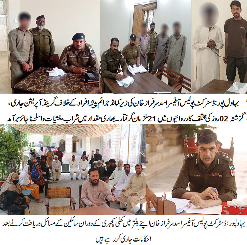 بہاول پور( )ڈسٹرکٹ پولیس آفیسر اسد سرفراز خان کی زیر کمانڈ جرائم پیشہ افراد کے خلاف گرینڈ آپریشن جاری، گزشتہ 02روز کی مختلف کارروائیوں میں 21ملزمان گرفتار۔ بھاری مقدار میں شراب، منشیات و اسلحہ ناجائز برآمد۔ جرائم پیشہ افراد کے خلاف جاری کارروائیوں کو مزید تیز کیا جارہا ہے ، ڈی پی او اسد سرفراز خان