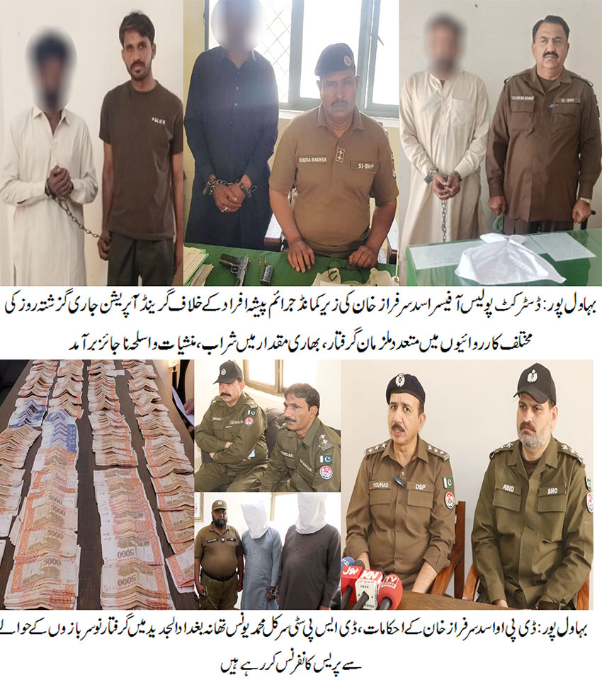 بہاول پور( )ڈسٹرکٹ پولیس آفیسر اسد سرفراز خان کی زیر کمانڈ جرائم پیشہ افراد کے خلاف گرینڈ آپریشن جاری، گزشتہ روز کی مختلف کارروائیوں میں 14ملزمان گرفتار۔ بھاری مقدار میں شراب، منشیات و اسلحہ ناجائز برآمد۔ جرائم پیشہ افراد کے خلاف جاری کارروائیوں کو مزید تیز کیا جارہا ہے ، ڈی پی او اسد سرفراز خان