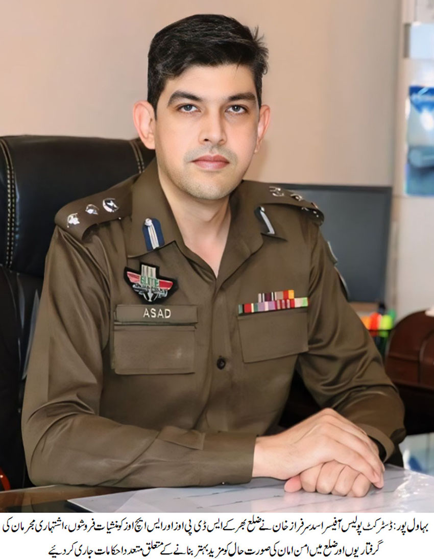 بہاولپور( )ڈسٹرکٹ پولیس آفیسر اسد سرفراز خان نے ضلع بھر کے ایس ڈی پی اوز اور ایس ایچ اوز کو منشیات فروشوں اور اشتہاری مجرمان کے خلاف جاری آپریشن کو مزید تیز کرنے کے ساتھ ساتھ ضلع میں امن وامان کی صورت حال کو مزید بہتر بنانے کیلئے متعدد احکامات جاری کر دیئے ۔ محنت اور جانفشانی سے کام نہ کرنے والوں کا سخت محکمانہ احتساب کیا جائے گا، روزانہ کی بنیاد پر پراگرس چیک جائے گی، ڈی پی او اسد سرفرار خان