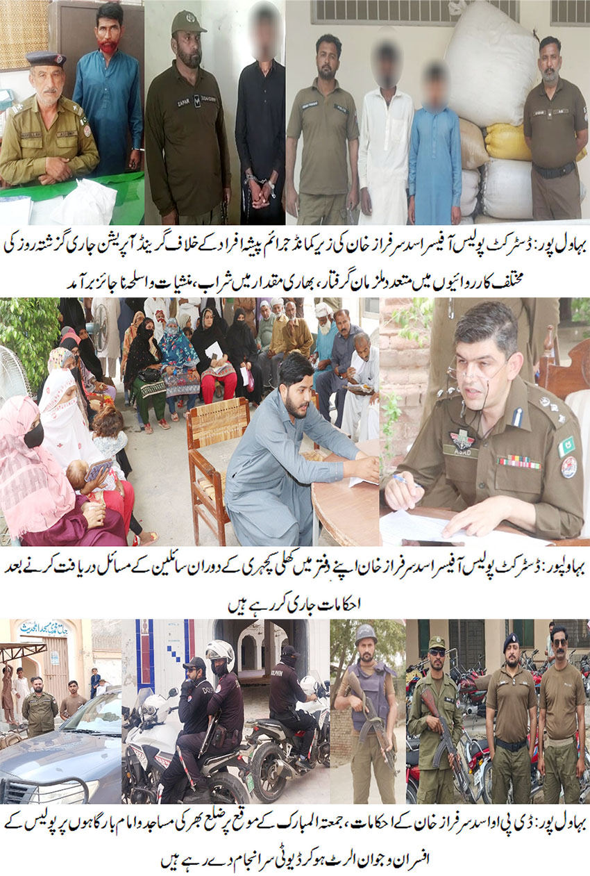 بہاول پور( )ڈسٹرکٹ پولیس آفیسر اسد سرفراز خان کی زیر کمانڈ جرائم پیشہ افراد کے خلاف گرینڈ آپریشن جاری، گزشتہ روز کی مختلف کارروائیوں میں 06ملزمان گرفتار۔ بھاری مقدار میں منشیات و اسلحہ ناجائز برآمد۔ جرائم پیشہ افراد کے خلاف جاری کارروائیوں کو مزید تیز کیا جارہا ہے ، ڈی پی او اسد سرفراز خان