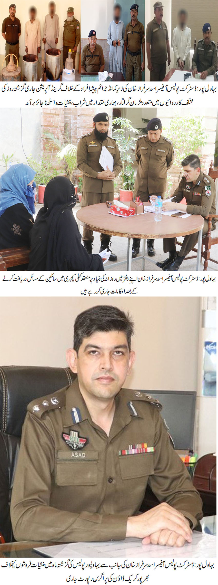 بہاولپور(       )ڈسٹرکٹ پولیس آفیسر اسد سرفراز خان کا شہریوں کے مسائل ترجیحی بنیادوں پر حل کرنے کیلئے روزانہ کی بنیاد پر اپنے دفتر میں کھلی کچہری کا انعقاد، 55سے زائد شہریوں نے اپنے مسائل ڈی پی او کے سامنے رکھے۔  پراپرٹی کے مقدمات میں جلد ریکوری کرکے رپورٹ پیش کرنے کے احکامات جاری کیے، شہریوں کے مسائل ترجیحی بنیادوں پر حل کرنا اصل مقصد ہے ،ڈی پی او اسد سرفراز خان