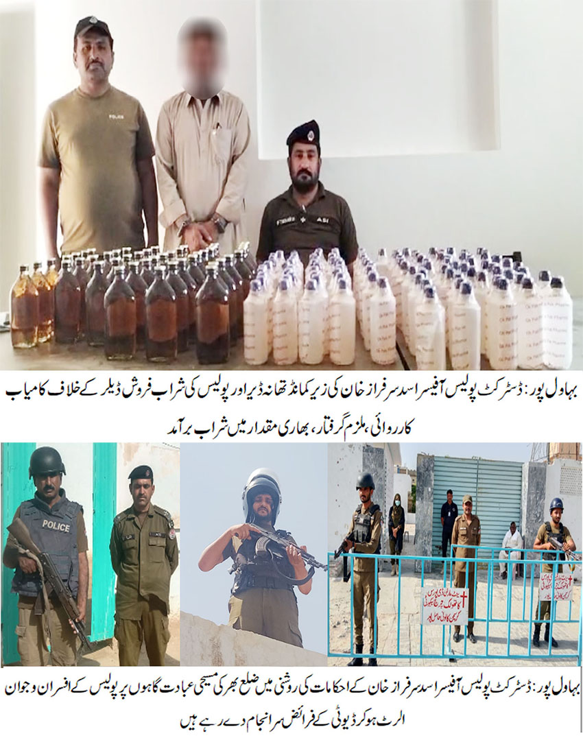 تفصیلات کے مطابق انسپکٹر جنرل آف پولیس پنجاب کی طرف سے سماج دشمن عناصر کی سرکوبی کے لئے جاری کردہ احکامات کی روشنی میں ڈسٹرکٹ پولیس آفیسر اسد سرفراز خان کی زیر کمانڈ ایس ایچ او تھانہ ڈیراور نے خفیہ انفارمیشن پر سپیشل ٹیم تشکیل دے کر شراب کی بڑی سپلائی ناکام بناتے ہوئے ڈیلرسے بھاری مقدار میں شراب برآمد کر لی۔پولیس نے شراب کے ڈیلر نوید اقبال جو کہ ٹوبہ ٹیک سنگھ کا رہائشی ہے کو گرفتار کر لیا۔ ملزم سے 70بوتلیں ولائتی شراب اور 100عدد کپی برآمد کر لیں، ملزم شراب ڈیراور، یزمان و مضافات میں سپلائی کرتا تھا۔ پولیس نے گرفتار ملزم کے خلاف مقدمہ درج کرکے تفتیش شروع کر دی۔ڈی پی او سرفراز خان نے اس حوالے سے بات کرتے ہوئے کہا کہ ڈیراور پولیس نے نوجوان نسل کو بڑی تباہی سے بچا لیا۔ گرفتار شراب کے ڈیلر کے دیگر نیٹ ورک کو بھی بے نقاب کرتے ہوئے قانون کے کٹہرے میں لایا جائے گا۔بہترین کارکردگی پر ڈی پی او اسد سرفراز خان نے ایس ایچ او تھانہ ڈیراور اور ان کی ٹیم کو شاباش دی۔