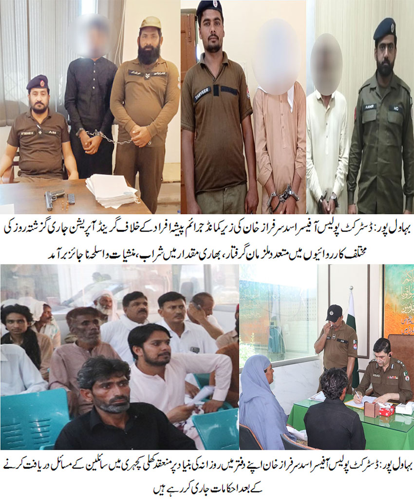 بہاول پور(      )ڈسٹرکٹ پولیس آفیسر اسد سرفراز خان کی زیر کمانڈ جرائم پیشہ افراد کے خلاف گرینڈ آپریشن جاری، گزشتہ روز کی مختلف کارروائیوں میں 06ملزمان گرفتار۔ بھاری مقدار میں شراب، منشیات و اسلحہ ناجائز برآمد۔ جرائم پیشہ افراد کے خلاف جاری کارروائیوں کو مزید تیز کیا جارہا ہے ، ڈی پی او اسد سرفراز خان