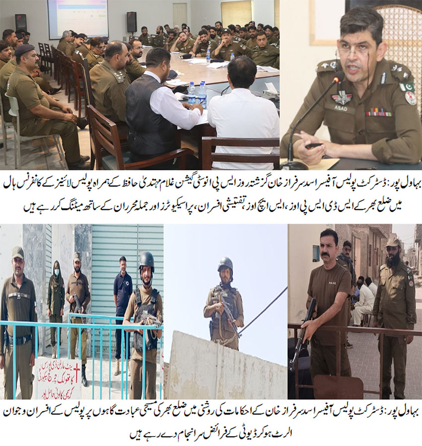 بہاو ل پور( )ڈسٹرکٹ پولیس آفیسر اسد سرفراز خان کے احکامات کی روشنی میں مسیحی عبادت گاہوں کی سیکیورٹی کے سخت انتظامات، سینکڑوں پولیس افسران و اہلکار ڈیوٹی پر تعینات، مسیحی برادری سمیت تمام شہریوں کی حفاظت ہمارے اولین فرائض میں شامل ہے، ڈی پی او اسد سرفراز خان
