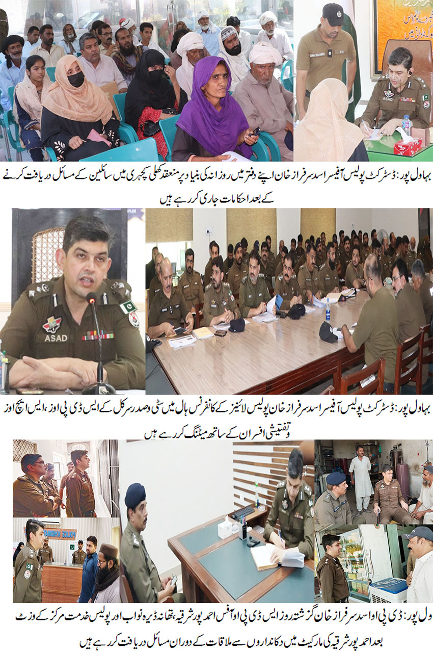 بہاولپور( )ڈسٹرکٹ پولیس آفیسر اسد سرفراز خان کا شہریوں کے مسائل ترجیحی بنیادوں پر حل کرنے کیلئے روزانہ کی بنیاد پر اپنے دفتر میں کھلی کچہری کا انعقاد، 38سے زائد شہریوں نے اپنے مسائل ڈی پی او کے سامنے رکھے۔ پراپرٹی کے مقدمات میں جلد ریکوری کرکے رپورٹ پیش کریں، تاخیر کسی صورت برداشت نہیں کی جائے گی، شہریوں کے مسائل حل کرنے کیلئے ہر ممکن وسائل کو بروئے کار لایا جا رہا ہے ،ڈی پی او اسد سرفراز خان