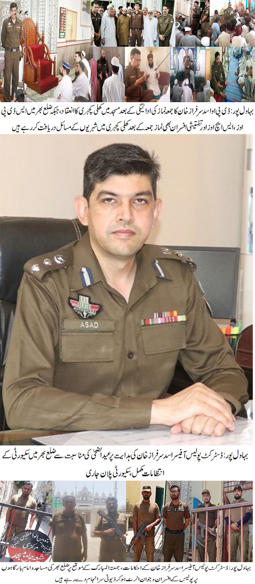 بہاول پور( )ڈی پی او اسد سرفراز خان کے احکامات، جمعتہ المبارک کے روز ایس ڈی پی اوز اور ایس ایچ اوز کے سیکیورٹی کے حوالے سے مساجد اور امام بارگاہوں کے وزٹ، موجودہ ملکی صورتحال کے پیش نظر ڈیوٹی پر مامور اہلکاروں کو الرٹ رہنے کی ہدایت، سیکیورٹی فرائض میں غفلت ہرگز برداشت نہیں کی جائے گی، ڈسٹرکٹ پولیس آفیسر اسد سرفراز خان