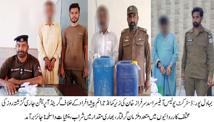 بہاول پور( )ڈسٹرکٹ پولیس آفیسر اسد سرفراز خان کی زیر کمانڈ جرائم پیشہ افراد کے خلاف گرینڈ آپریشن جاری، گزشتہ روز کی مختلف کارروائیوں میں 10ملزمان گرفتار۔ بھاری مقدار میں شراب، منشیات و اسلحہ ناجائز برآمد۔ جرائم پیشہ افراد کے خلاف جاری کارروائیوں کو مزید تیز کیا جارہا ہے ، ڈی پی او اسد سرفراز خان
