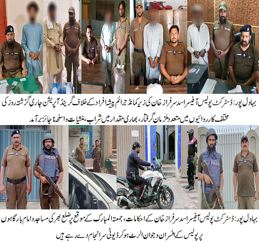 بہاول پور( )ڈسٹرکٹ پولیس آفیسر اسد سرفراز خان کی زیر کمانڈ جرائم پیشہ افراد کے خلاف گرینڈ آپریشن جاری، گزشتہ روز کی مختلف کارروائیوں میں 12ملزمان گرفتار۔ بھاری مقدار میں شراب، منشیات و اسلحہ ناجائز برآمد۔ جرائم پیشہ افراد کے خلاف جاری کارروائیوں کو مزید تیز کیا جارہا ہے ، ڈی پی او اسد سرفراز خان