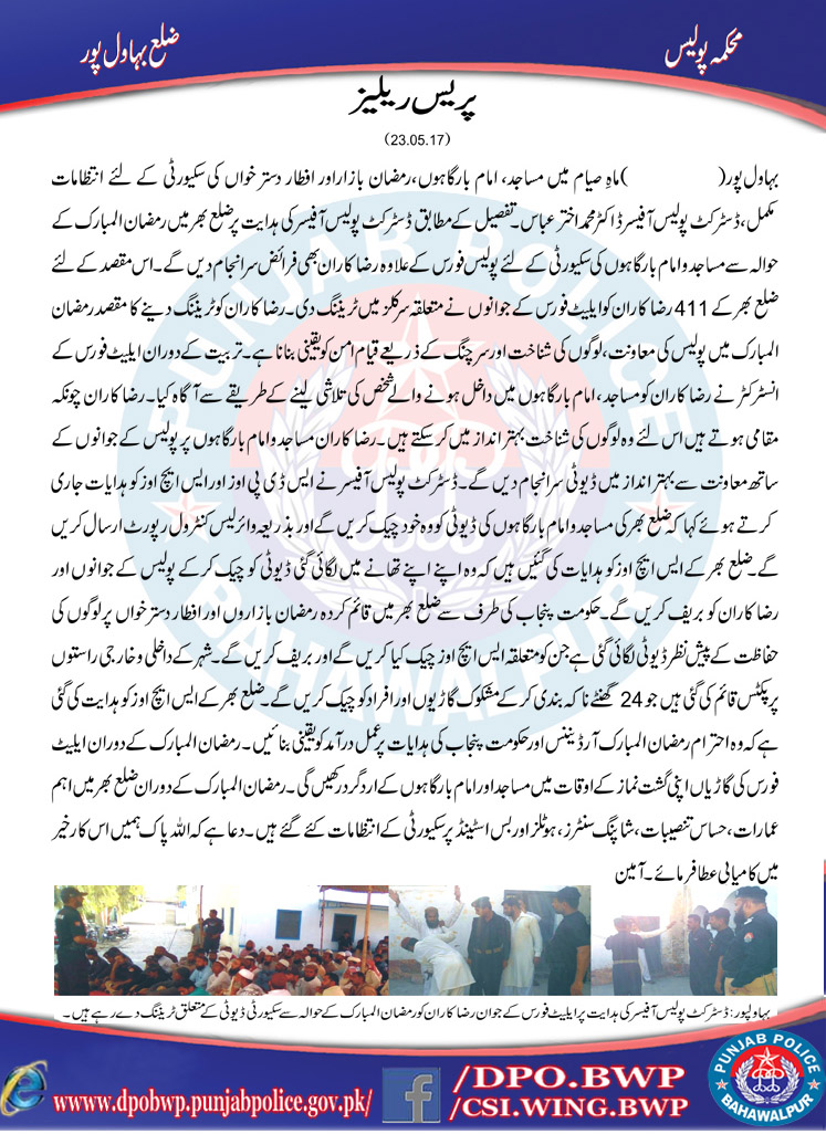 ماہِ صیام میں مساجد ، امام بارگاہوں ، رمضان بازار ، افطار دستر خواں کی سکیورٹی کے انتظامات مکمل کر لیے گئے ۔ڈسٹرکٹ پولیس آفیسر ڈاکٹر محمداختر عباس