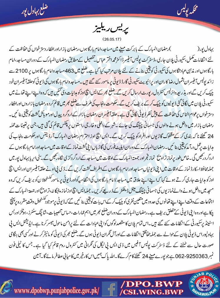 رمضان المبارک کے بابرکت مہینے میں مساجد و امام بارگاہوں ، رمضان بازار اور افطار دستر خواں کی حفاظت کے انتظامات مکمل ،سکیورٹی پلان جاری، ۔ڈسٹرکٹ پولیس آفیسر ڈاکٹر محمد اختر عباس