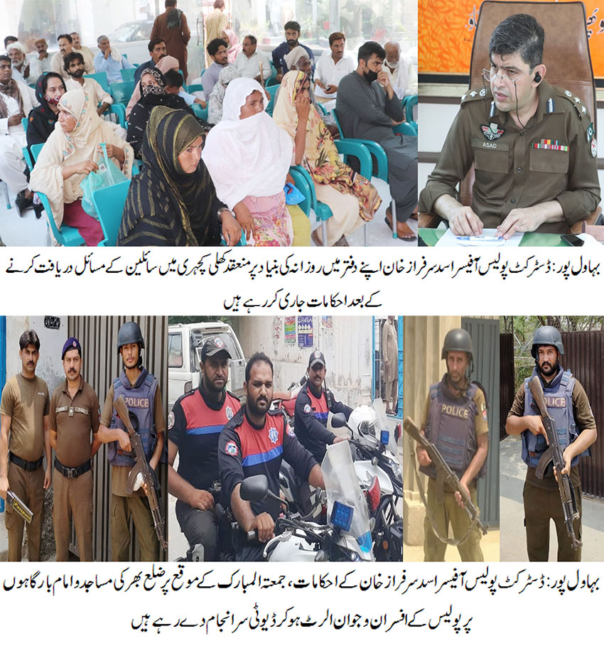 بہاول پور( )ڈی پی او اسد سرفراز خان کے احکامات، جمعتہ المبارک کے روز ایس ڈی پی اوز اور ایس ایچ اوز کے سیکیورٹی کے حوالے سے مساجد اور امام بارگاہوں کے وزٹ، موجودہ ملکی صورتحال کے پیش نظر ڈیوٹی پر مامور اہلکاروں کو الرٹ رہنے کی ہدایت، سیکیورٹی فرائض میں غفلت ہرگز برداشت نہیں کی جائے گی، ڈسٹرکٹ پولیس آفیسر اسد سرفراز خان