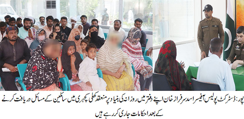 تفصیلات کے مطابق وزیر اعلی پنجاب اور انسپکٹر جنرل آف پولیس پنجاب کے ویژن اور احکامات کی روشنی میں ڈی پی او اسد سرفراز خان کی روزانہ کی بنیاد پر اپنے دفتر میں کھلی کچہری کے دوران25سے زائد شہریوں کے مسائل دریافت کئے۔ ڈی پی او اسد سرفراز خان نے کھلی کچہری میں تمام سائلین کو باری باری تفصیل سے سنا اور انفرادی طور پر متعلقہ افسران کو بذریعہ فون کال بروقت قانونی کارروائی اور واپسی رپورٹ کے احکامات جاری کیے جبکہ متعدد ایس ایچ اوز کو کھلی کچہری میں طلب کر کے براہ راست جواب طلبی کی۔ کھلی کچہری میں ڈی پی او اسد سرفراز خان نے متعدد سائلین کی درخواستوں پر انکوائریوں کا حکم دیا اور متعدد پر ایس ایچ اوز اور تفتیشی افسران سے کھلی کچہری میں متعلقہ شہری کی موجودگی میں مقدمات کی پراگریس لی۔ ریکوری کے مقدمات میں ڈی پی او اسد سرفراز خان نے تفتیشی افسران کو حکم دیا ایک ہفتے کے اندر اندر ریکوری کرکے مدعی مقدمہ کے حوالے کر کے رپورٹ جمع کروائیں۔ ڈی پی او اسد سرفراز خان نے کھلی کچہری میں شہریوں سے بات کرتے ہوئے کہا کہ کھلی کچہری کا مقصد ہیکہ شہریوں اور پولیس افسران کے درمیان خلیج نہ رہے اور تمام جائز مسائل بروقت میرٹ پر حل ہوں۔انہوں نے مزید کہا کہ مقدمات کو طے شدہ ضابطہ کے مطابق بر وقت یکسو نہ کرنا اور شہریوں کو انصاف فراہم نہ کرنے والے افسران سے جواب طلبی کی جا رہی ہے، سرکل اور تھانہ جات میں موجود افسران شہریوں کو پہلی فرصت میں انصاف فراہم کریں۔انہوں نے ایس ڈی پی اوز اور ایس ایچ اوز کو ہدایات جاری کرتے ہوئے کہا کہ عوام الناس کے مسائل ان کی دہلیز پر ہی حل کیے جائیں اور یہی ہمارا اولین فرض بھی ہے۔