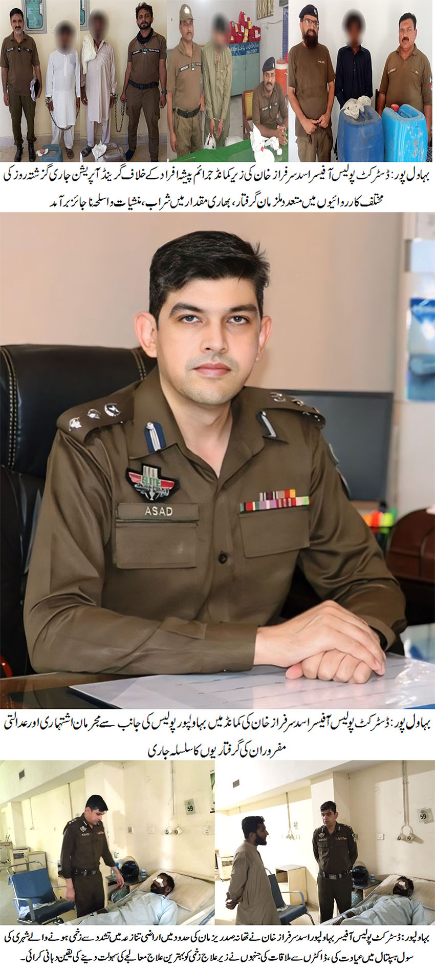 بہاول پور(      )ڈسٹرکٹ پولیس آفیسربہاولپور اسد سرفراز خان کی زیر کمانڈ جرائم پیشہ افراد کے خلاف گرینڈ آپریشن جاری، گزشتہ روز کی مختلف کارروائیوں میں 08ملزمان گرفتار۔ بھاری مقدار میں شراب، منشیات و اسلحہ ناجائز برآمد۔ جرائم پیشہ افراد کے خلاف جاری کارروائیوں کو مزید تیز کیا جارہا ہے ، ڈی پی اوبہاولپور اسد سرفراز خان