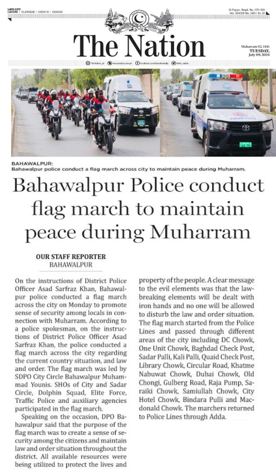 Speaking on the occasion, DPO Bahawalpur said that the purpose of the flag march was to create a sense of security among the citizens and maintain law and order situation throughout the district. All available resources were being utilized to protect the lives and property of the people. A clear message to the evil elements was that the law-breaking elements will be dealt with iron hands and no one will be allowed to disturb the law and order situation. The flag march started from the Police Lines and passed through different areas of the city including DC Chowk, One Unit Chowk, Baghdad Check Post, Sadar Palli, Kali Palli, Quaid Check Post, Library Chowk, Circular Road, Khatme Nabuwat Chowk, Dubai Chowk, Old Chongi, Gulberg Road, Raja Pump, Saraiki Chowk, Samiullah Chowk, City Hotel Chowk, Bindara Pulli and Macdonald Chowk. The marchers returned to Police Lines through Adda.