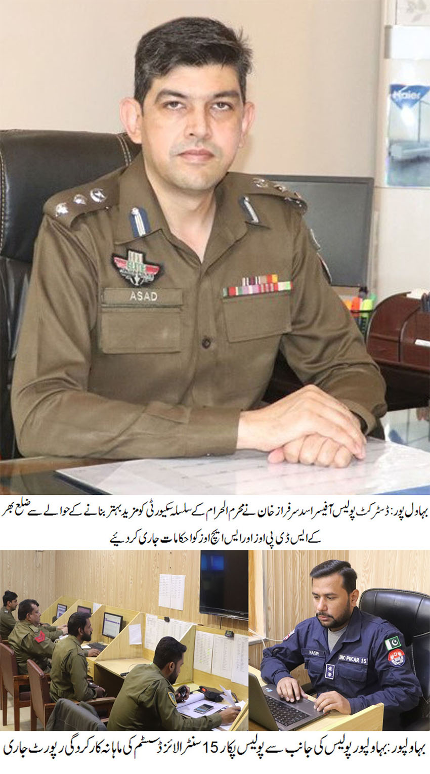 تفصیلات کے مطابق انسپکٹر جنرل آف پولیس پنجاب کے احکامات کی روشنی میں محرم الحرام کے سلسلہ میں ضلع بھر میں سکیورٹی کے فول پروف انتظامات کئے گئے ہیں ۔ اس حوالے سے ڈی پی او بہاولپور اسد سرفرازخان نے ضلع بھر کے ایس ڈی پی اوز اور ایس ایچ اوز کومزیدہدایات جاری کرتے ہوئے کہا کہ  جلوسوں کے راستوں میں آنے والی عمارتوں کی چھتوں پر سنائیپرز ملازمین کو ڈیوٹی پر مامور کریں ۔جلو س اور مجالس کے اوقات کار میں دکانوں کے ساتھ ساتھ نزدیکی رہائشی مکانات کے دروازے اور کھڑکیاں بند رکھوائی جائیں۔ ایس ڈی پی اوز اور ایس ایچ اوز تمام ملازمان کو ڈیوٹی شروع ہونے سے پہلے چیک کرکے بریف کریں گے اور ڈیوٹی کی حساسیت کے بارے میں آگاہ کریں گے۔ ڈیوٹی الرٹ ہوکر سرانجام دی جائے تاکہ کوئی ناخوشگوار واقعہ رونما نہ ہوسکے ۔موجودہ ملکی حالات کے پیش نظر سکیورٹی ڈیوٹیاں خاص طور پر اہمیت کی حامل ہیں محرم الحرام کی ڈیوٹیاں ان ایام میں خاص اہمیت رکھتی ہیں جن پر کوئی سستی لاپرواہی نہ برتی جائے۔ ایس ڈی پی اوز اور ایس ایچ اوز ڈیوٹی پوائنٹس پر لگائی گئی نفری کی حاضری کو یقینی بنانے کے ساتھ ساتھ کمی نفری کی صورت میں انتظامی کمیٹیوں سے رابطہ کرکے رضاکاروں کی ڈیوٹیاں لگائیں ۔ ڈی پی او آفس میں کنٹرول روم قائم کیا گیا ہے ۔ ڈی پی اوآفس بہاول پور میں واقع یہ کنٹرول روم یکم محرم الحرام سے 12محرم الحرام تک 24گھنٹے ڈیوٹی سرانجام دے گا۔