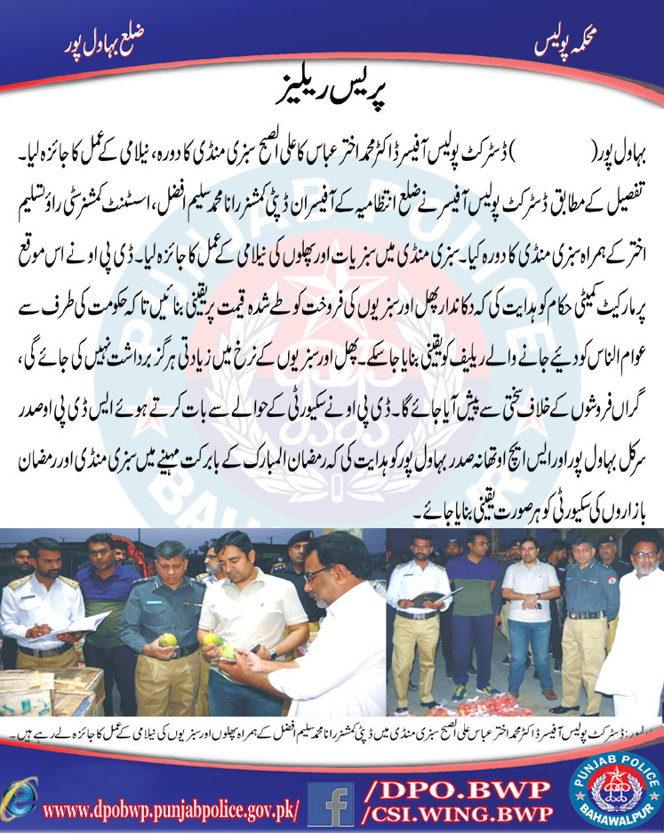 ڈسٹرکٹ پولیس آفیسر ڈاکٹر محمد اختر عباس نے اعلی الصبح سبزی منڈی کا دورہ کیا اور نیلامی کے عمل کا جائزہ لیا