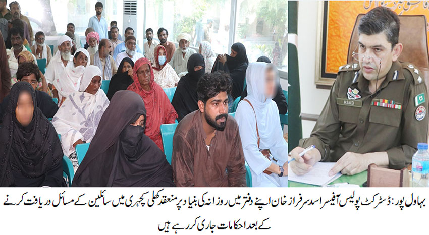 بہاولپور( )ڈسٹرکٹ پولیس آفیسر اسد سرفراز خان کا شہریوں کے مسائل ترجیحی بنیادوں پر حل کرنے کیلئے روزانہ کی بنیاد پر اپنے دفتر میں کھلی کچہری کا انعقاد، 50سے زائد شہریوں نے اپنے مسائل ڈی پی او کے سامنے رکھے۔ پراپرٹی کے مقدمات میں جلد ریکوری کرکے رپورٹ پیش کریں، تاخیر کسی صورت برداشت نہیں کی جائے گی، شہریوں کے مسائل حل کرنے کیلئے ہر ممکن وسائل کو بروئے کار لایا جا رہا ہے ،ڈی پی او اسد سرفراز خان