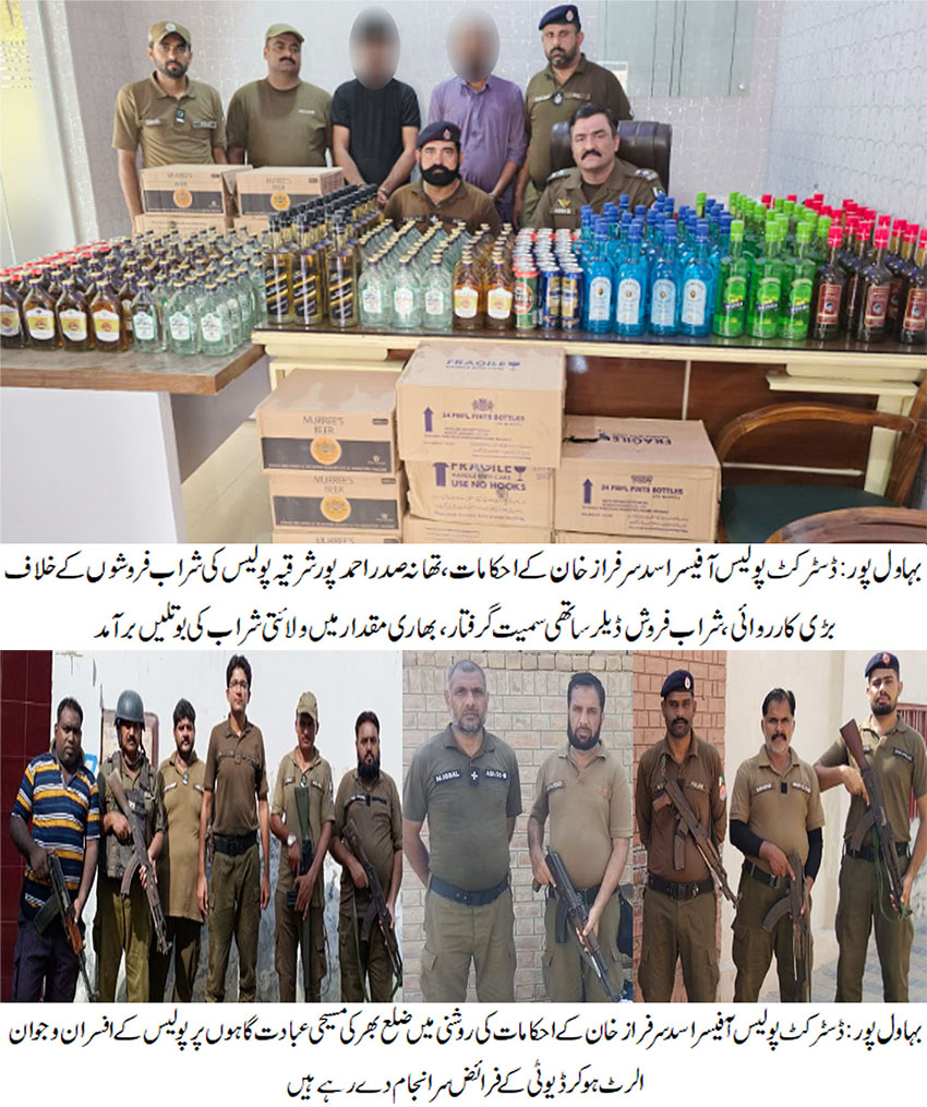 تفصیلات کے مطابق ڈی پی او بہاولپور اسد سرفرازخان کی طرف سے جرائم پیشہ افراد کے خلاف جاری مہم میں بڑی کامیابیاں ملنے کا سلسلہ جاری ہے۔ تھانہ صدر احمد پورشرقیہ پولیس نے سپیشل ٹیمیں تشکیل دے کر شراب فروشوں کے خلاف بھرپورکارروائیاں عمل میں لاتے ہوئے لاہور کے رہائشی 02ملزمان نعمان افضل اور بابر عنائت کوگرفتار کرکے ان کے قبضہ سے 348ولائتی شراب کی مختلف اقسام کی بوتلیں اور 140عدد ٹن پیک برآمد کرلئے۔صدر احمد پور شرقیہ پولیس نے ملزمان کی زیر استعمال گاڑی بھی قبضہ میں لے لی۔ ملزمان نے شراب احمد پور شرقیہ و گردنواح میں سپلائی کرنی تھی ۔پولیس نے گرفتار ملزمان کے خلاف مقدمہ درج کر کے تفتیش شروع کر دی۔ اس موقع پر ڈی پی او اسد سرفرازخان نے اپنے پیغام میں کہا کہ جرم جیسا بھی ہو قانون سے کسی صورت بچ نہیں سکتا، سماج دشمن عناصر کے خلاف جاری آپریشن کو مزید تیز کیا جارہا ہے، معاشرے کو ایسے ناسور عناصر سے پاک کرنا پولیس کی اولین ترجیح ہے۔ڈی پی او بہاولپور نے شراب فروشوں کے خلاف کامیاب کارروائی کرنے پر ایس ایچ او تھانہ صدر احمد پور شرقیہ اور ان کی ٹیم کو شاباش دی۔
