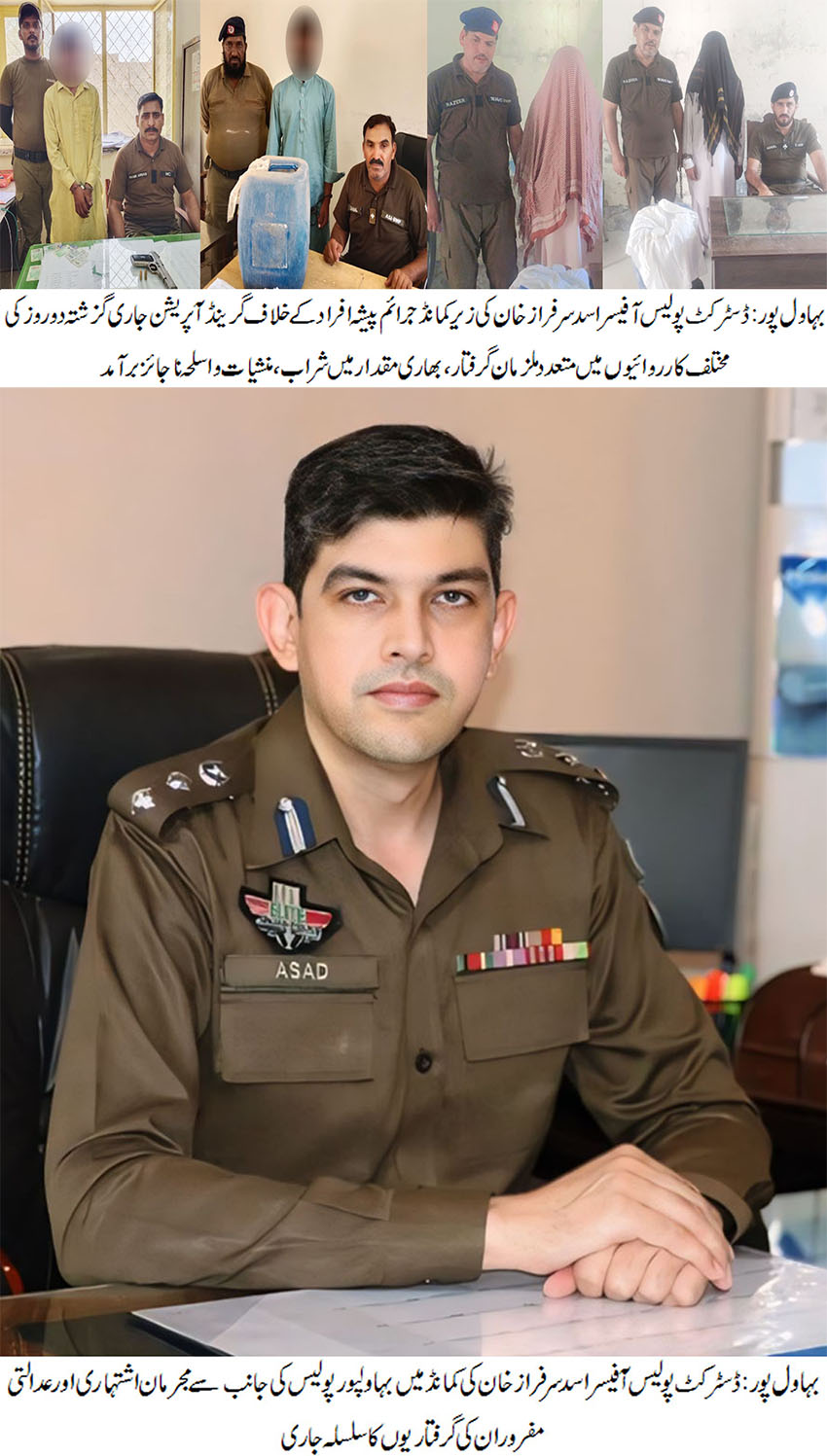 بہاول پور( )ڈسٹرکٹ پولیس آفیسربہاولپور اسد سرفراز خان کی زیر کمانڈ جرائم پیشہ افراد کے خلاف گرینڈ آپریشن جاری، گزشتہ دو روز کی مختلف کارروائیوں میں 16ملزمان گرفتار۔ بھاری مقدار میں شراب، منشیات و اسلحہ ناجائز برآمد۔ جرائم پیشہ افراد کے خلاف جاری کارروائیوں کو مزید تیز کیا جارہا ہے ، ڈی پی اوبہاولپور اسد سرفراز خان