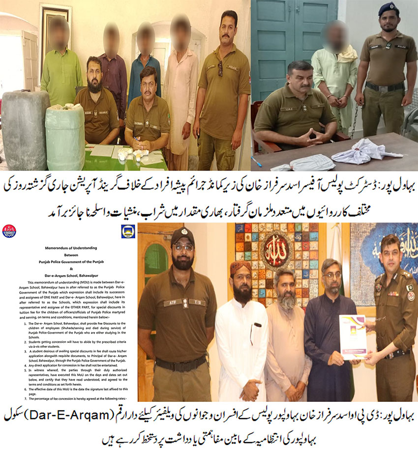 بہاول پور( )ڈسٹرکٹ پولیس آفیسربہاولپور اسد سرفراز خان کی زیر کمانڈ جرائم پیشہ افراد کے خلاف گرینڈ آپریشن جاری، گزشتہ روز کی مختلف کارروائیوں میں 08ملزمان گرفتار۔ بھاری مقدار میں شراب، منشیات و اسلحہ ناجائز برآمد۔ جرائم پیشہ افراد کے خلاف جاری کارروائیوں کو مزید تیز کیا جارہا ہے ، ڈی پی اوبہاولپور اسد سرفراز خان