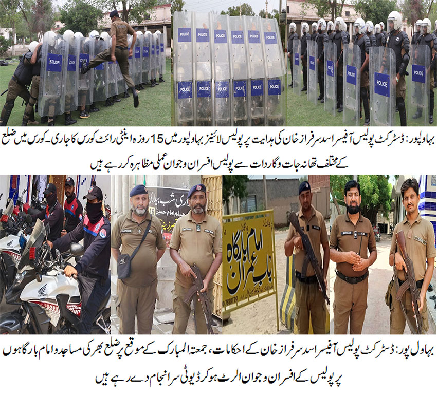تفصیلات کے مطابق انسپکٹر جنرل آف پولیس پنجاب کی ہدایت پراورڈسٹرکٹ پولیس آفیسراسد سرفرازخان کے احکامات کی روشنی میں بہاولپور پولیس لائینز میں15 روزہ اینٹی رائٹ کورس جاری ہے ،جس میں ضلع کے مختلف تھانہ جات اور گاردات سے آئے پولیس ملازمان کو دور جدید کے حامل ترکش اینٹی رائٹ سامان کے متعلق بریف کیاگیا اور خصوصی ٹرینرز نے تربیت اور خصوصی لیکچرز دیے۔دوران ریفریشر کورس شرکا ء کو اس کے اغراض و مقاصد کے بارہ میں آگاہی دی گئی اور اینٹی رائٹ کے متعلق مکمل بریف کیا گیا کہ کسی بھی ہنگامی صورت حال میں ان کا رد عمل کیسا ہونا چاہیے اور ان کو کس طرح کے حفاظتی انتظامات اپنانے چاہئیں۔ اس موقع پر جوانوں نے لا اینڈ آرڈر کے حوالے سے مشتعل ہجوم سے نمٹنے ،مجمع خلاف قانون کو منتشر کرنے اور آنسو گیس کے استعمال کا عملی مظاہرہ کیا ۔ڈسٹرکٹ پولیس آفیسر بہاولپورنے اس حوالے سے بات کرتے ہوئے کہا کہ ہنگامی صورتحال میں متحد رہتے ہوئے منظم طریقے سے اپنے فرائض سرانجام دینے اور مشتعل ہجوم کو کنڑول کرنے کے ساتھ ساتھ سرکاری املاک کی بھی حفاظت کو یقینی بنایا جاتا ہے۔ انہوں نے مزید کہا کہ کورسز سے پیشہ ورانہ امور کی انجام دہی کی استعداد کار میں اضافہ ہوتا ہے۔