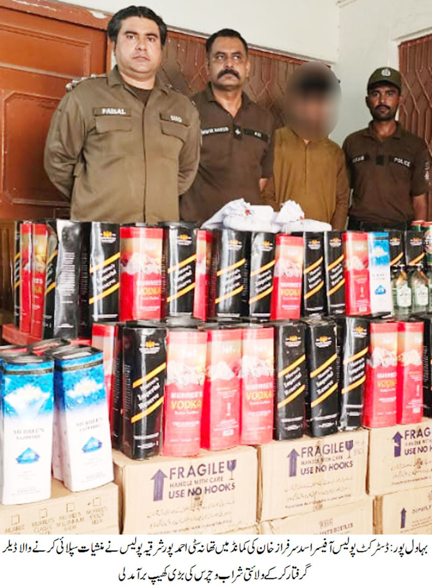 بہاول پور( )ڈسٹرکٹ پولیس آفیسراسد سرفرازخان کی کمانڈ میں تھانہ سٹی احمد پور شرقیہ پولیس کی منشیات فروشوںکے خلاف کامیاب کارروائی،ولائتی شراب اور منشیات کی بڑی کھیپ برآمد،منشیات سپلائی کرنے والا ڈیلرگرفتار، مقدمہ درج ۔ بہاولپور کو منشیات فری زون بنانے کا عزم ہرصورت پورا کیاجائے گا، ڈی پی اواسد سرفرازخان