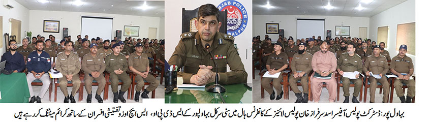 تفصیلات کے مطابق وزیر اعلی پنجاب اور انسپکٹر جنرل آف پولیس پنجاب کی کرائم کنٹرول اور معاشرے میں امن وامان کی صورت حال کو قائم رکھنے کے حوالے سے جاری کردہ پالیسی کو مد نظر رکھتے ہوئے ڈسٹرکٹ پولیس آفیسر اسد سرفراز خان نے سٹی سرکل بہاولپورکے ایس ڈی پی او، ایس ایچ اوز اور تفتیشی افسران سے میٹنگ کی ۔میٹنگ میں سٹی سرکل کے ایس ڈی پی اومحمد یونس نے مقدمات بارے ڈی پی او اسد سرفراز خان کو بریفنگ دی۔ جس پر ڈی پی او اسد سرفراز خان نے کہا کہ روزانہ کی پراگرس چیک کی جا رہی ہے۔ اشتہاری مجرمان کی گرفتاریوں کا تحرک تیز کیا جائے اور پرانے ملزمان کو اشتہاری قرار دلوایا جائے۔ قتل، اقدام قتل، ڈکیتی، رابری اور سنگین مقدمات کی تفتیش میرٹ اور متعینہ وقت کے اندر کی جائے۔ زیر تفتیش مقدمات کو جلد از جلد یکسو کیا جائے، اور چالان دی گئی ڈیڈ لائین میں عدالت جمع کرواے جائیں۔ ہاٹ سپاٹ والے ایریاز کی خصوصی نگرانی کریں۔ گشت کے نظام کو موثر اور سماج دشمن عناصر کے خلاف بھر پور کارروائیاں عمل میں لائیں تاکہ لوگوں کی قیمتی جانوں کو محفوظ بنایا جاسکے۔منشیات فروشوں کے خلاف روزانہ کی بنیاد پر کارروائیوں کو تیز کیا جائے۔ تھانہ پر آنے والی درخواستوں کو میرٹ پر متعین کردہ وقت میں حل کیا جائے۔انہوں نے مزید کہا کہ میری پالیسی صرف اور صرف میرٹ ہے، شہریوں کو زیادہ سے زیادہ ریلیف مہیا کرنا میری اولین ترجیح ہے۔ پولیس کی طرف سے کسی بھی شہری کی ساتھ زیادتی یا بد عنوانی کی شکایت پر سخت احتساب عمل میں لایا جائے گا۔