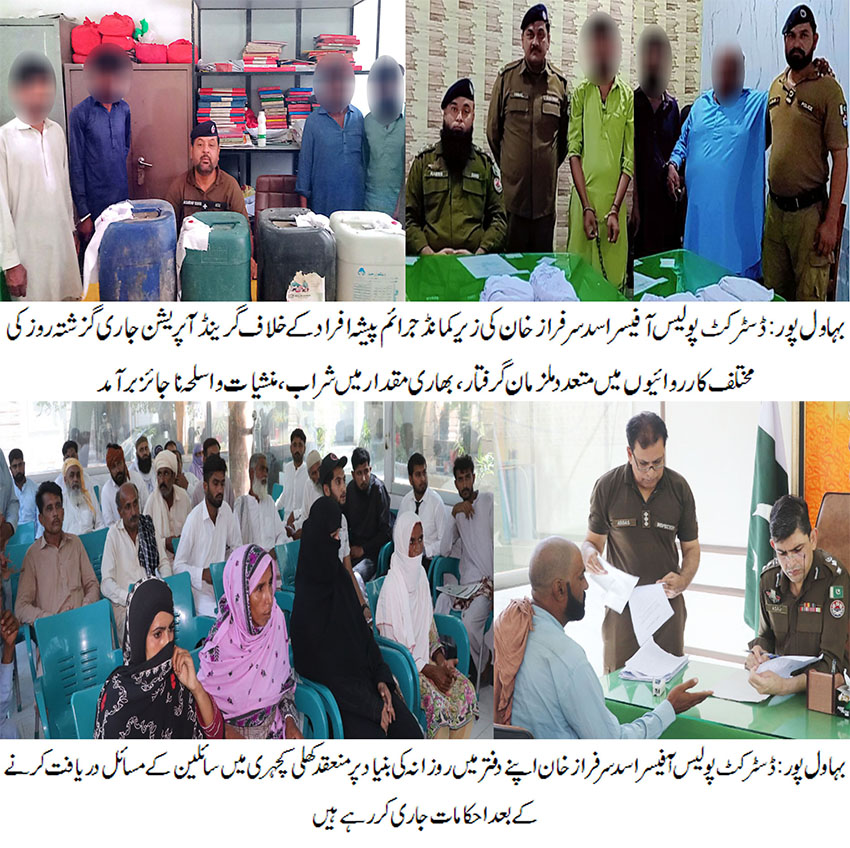 بہاول پور( )ڈسٹرکٹ پولیس آفیسربہاولپور اسد سرفراز خان کی زیر کمانڈ جرائم پیشہ افراد کے خلاف گرینڈ آپریشن جاری، گزشتہ روز کی مختلف کارروائیوں میں 16ملزمان گرفتار۔ بھاری مقدار میں شراب، منشیات و اسلحہ ناجائز برآمد۔ جرائم پیشہ افراد کے خلاف جاری کارروائیوں کو مزید تیز کیا جارہا ہے ، ڈی پی اوبہاولپور اسد سرفراز خان