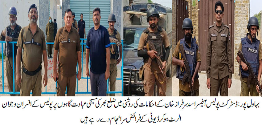 بہاو ل پور( )ڈسٹرکٹ پولیس آفیسر اسد سرفراز خان کے احکامات کی روشنی میں مسیحی عبادت گاہوں کی سیکیورٹی کے سخت انتظامات، سینکڑوں پولیس افسران و اہلکار ڈیوٹی پر تعینات، مسیحی برادری سمیت تمام شہریوں کی حفاظت ہمارے اولین فرائض میں شامل ہے، ڈی پی او اسد سرفراز خان