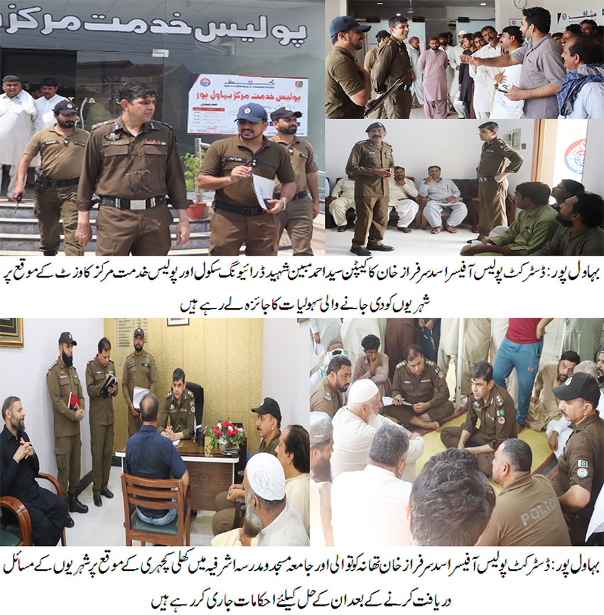 بہاول پور( )ڈسٹرکٹ پولیس آفیسر اسد سرفراز خان کی جانب سے تھانہ کوتوالی اور جامعہ مسجد و مدرسہ اشرفیہ علاقہ تھانہ سول لائینزمیں کھلی کچہری کا انعقاد کیا گیا۔ کھلی کچہری میں شہریوں کی بڑی تعداد کو سنا اور انفرادی طور پر متعلقہ افسران شہریوں کے مسائل بر وقت حل کرنے کے احکامات جاری کیے، کھلی کچہری کا مقصد بلاتاخیر شہریوں کے مسائل کو میرٹ پر حل کرنا اور گھر کی دہلیز پر انصاف فراہم کرنا ہے ،ڈی پی او اسد سرفراز خان