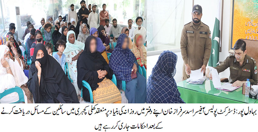 بہاولپور( )ڈسٹرکٹ پولیس آفیسر اسد سرفراز خان کا شہریوں کے مسائل ترجیحی بنیادوں پر حل کرنے کیلئے روزانہ کی بنیاد پر اپنے دفتر میں کھلی کچہری کا انعقاد، 60سے زائد شہریوں نے اپنے مسائل ڈی پی او کے سامنے رکھے۔ پراپرٹی کے مقدمات میں جلد ریکوری کرکے رپورٹ پیش کریں، تاخیر کسی صورت برداشت نہیں کی جائے گی، شہریوں کے مسائل حل کرنے کیلئے ہر ممکن وسائل کو بروئے کار لایا جا رہا ہے ،ڈی پی او اسد سرفراز خان