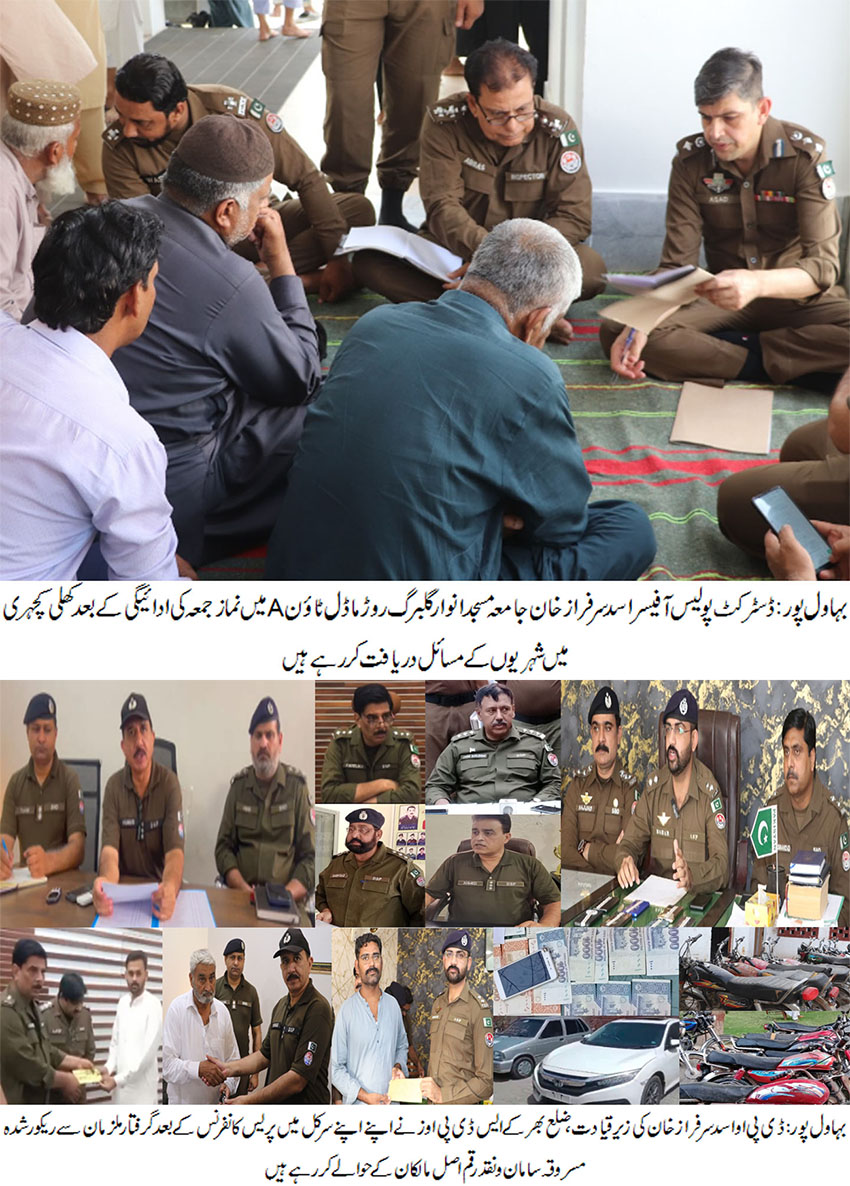 بہاول پور( )ڈسٹرکٹ پولیس آفیسر اسد سرفراز خان کی جانب سے جامعہ مسجد انوار گلبرگ روڈ ماڈل ٹائون میںبعد نماز جمعہ کھلی کچہری کا انعقاد کیا گیا۔ کھلی کچہری میں شہریوں کی بڑی تعداد کو سنا اور انفرادی طور پر متعلقہ افسران شہریوں کے مسائل بر وقت حل کرنے کے احکامات جاری کیے، کھلی کچہری کا مقصد بلاتاخیر شہریوں کے مسائل کو میرٹ پر حل کرنا اور گھر کی دہلیز پر انصاف فراہم کرنا ہے ،ڈی پی او اسد سرفراز خان