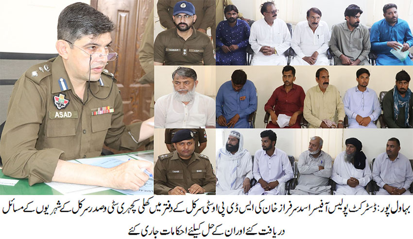 بہاول پور( )ڈسٹرکٹ پولیس آفیسر اسد سرفراز خان کی جانب سے ایس ڈی پی او سٹی کے دفتر میں کھلی کچہری کا انعقاد کیا گیا۔ کھلی کچہری میں سٹی و صدر سرکل کے شہریوں کی بڑی تعداد کو سنا اور انفرادی طور پر متعلقہ افسران شہریوں کے مسائل بر وقت حل کرنے کے احکامات جاری کیے، کھلی کچہری کا مقصد بلاتاخیر شہریوں کے مسائل کو میرٹ پر حل کرنا اور گھر کی دہلیز پر انصاف فراہم کرنا ہے ،ڈی پی او اسد سرفراز خان