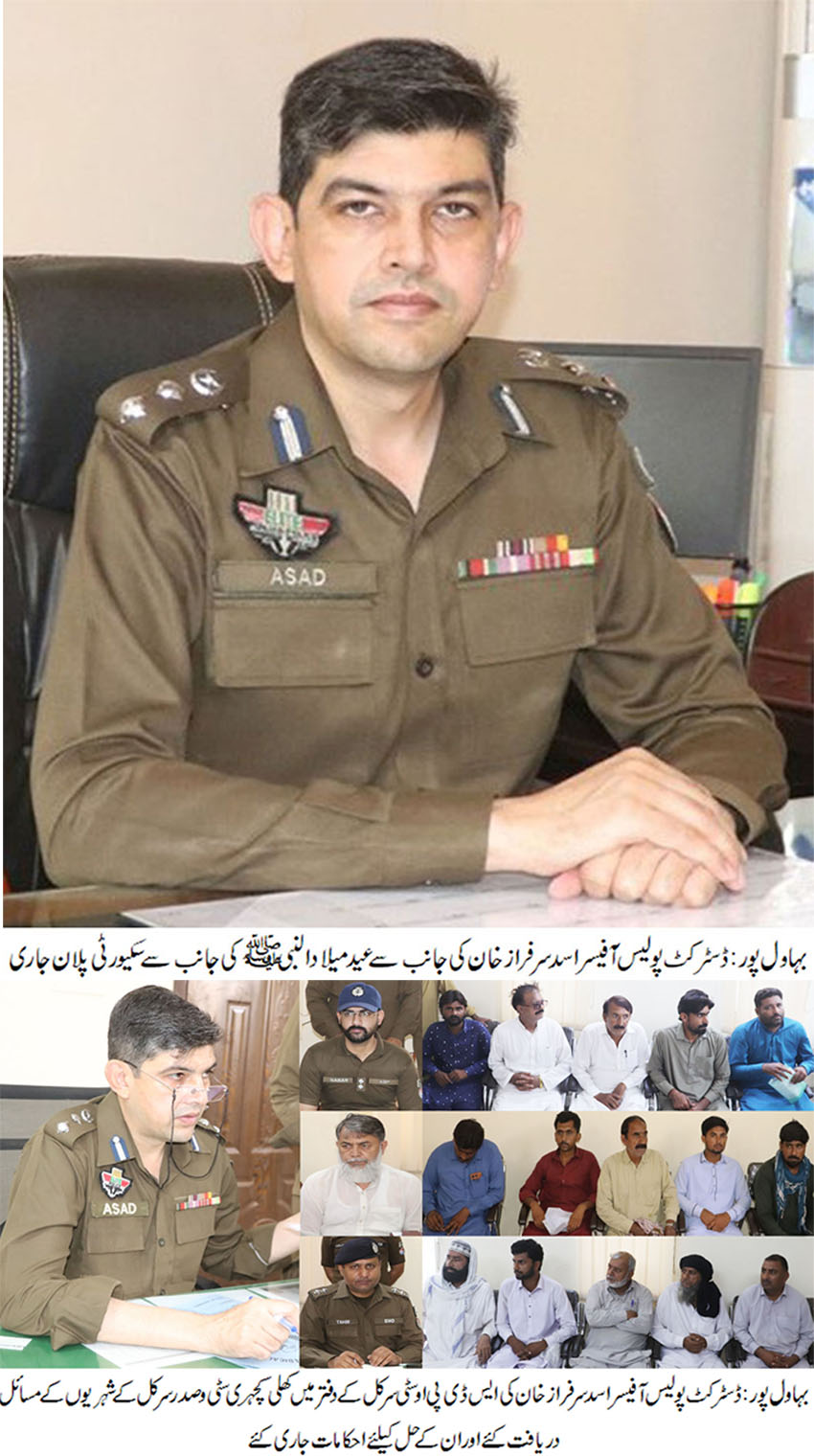 بہاول پور( )12ربیع الاول عید میلادالنبیﷺ کے حوالے پر سکیورٹی کے سخت انتظامات کئے گئے ہیں، ڈسٹرکٹ پولیس آفیسر اسد سرفراز خان کی جانب سے سکیورٹی پلان جاری ۔عید میلاد النبی ﷺ کے پر امن انعقاد کے حوالے سے ایس ڈی پی اوز اور ایس ایچ اوز کو ہدایات جاری، ڈی پی او بہاولپوراسد سرفرازخان