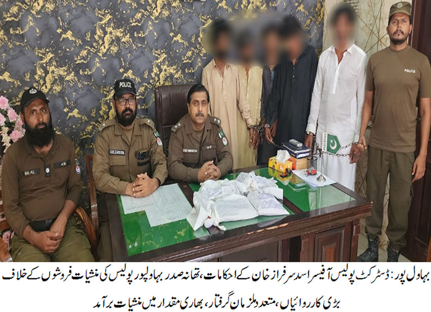 بہاول پور( )ڈسٹرکٹ پولیس آفیسراسد سرفرازخان کے احکامات ، تھانہ صدر بہاولپورپولیس کی منشیات فروشوںکے خلاف کامیاب کارروائی، بدنام زمانہ 05ملزمان گرفتار،بھاری مقدار میںمنشیات برآمد، ملزمان پابند سلاسل۔ جرائم پیشہ افراد کا تعاقب جاری رکھا جائیگا، ڈی پی او اسد سرفرازخان