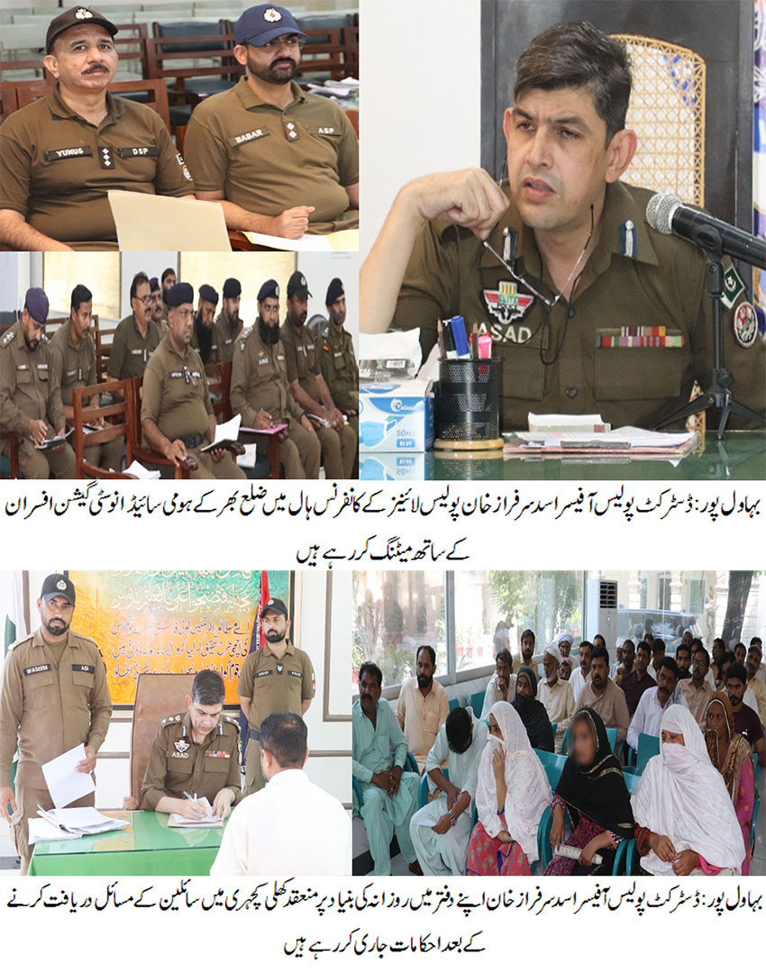 بہاولپور( )ڈسٹرکٹ پولیس آفیسر اسد سرفراز خان کا شہریوں کے مسائل ترجیحی بنیادوں پر حل کرنے کیلئے روزانہ کی بنیاد پر اپنے دفتر میں کھلی کچہری کا انعقاد، 35سے زائد شہریوں نے اپنے مسائل ڈی پی او کے سامنے رکھے۔ پراپرٹی کے مقدمات میں جلد ریکوری کرکے رپورٹ پیش کریں، تاخیر کسی صورت برداشت نہیں کی جائے گی، شہریوں کے مسائل حل کرنے کیلئے ہر ممکن وسائل کو بروئے کار لایا جا رہا ہے ،ڈی پی او اسد سرفراز خان